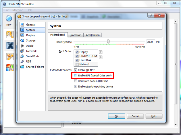 Your virtual machine will now be created. But don’t stop now–you still need to change a few settings before your machine will actually work. Your new virtual machine will show up on the left column of the Virtualbox start page.  Select your Mac OS X virtual machine (single-click) from the main page of Virtualbox, and open up the virtual machine settings. Once the settings open up, go to “System” and uncheck the “Enable EFI” box. This is by far the most important single setting that you will need to change.