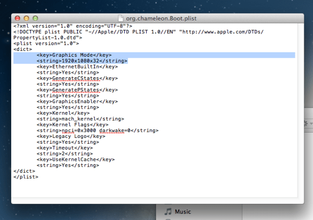 Open up Finder and go to the folder “Extra” in the main hard drive, and open the file org.Chameleon.boot.plist. Between <dict> and </dict> in the file, insert the following line.
