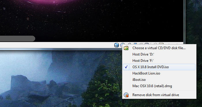 Your mouse cursor will probably be trapped inside the virtual machine. Press the right “Ctrl” key on your keyboard to allow your mouse to escape. Then, at the bottom right of the virtual machine screen, right-click on the little CD icon, and click “Choose a virtual CD/DVD disk file”. A Windows Explorer window will pop up; from there, select the OS X 10.8 Mountain Lion bootable DVD.