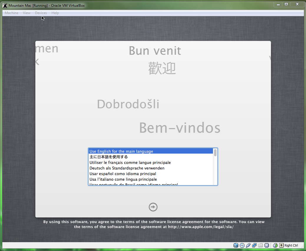 Select it (use the arrow keys on your computer) and press “Enter”. Mountain Lion will boot, and you should eventually be led to the Mac OS X setup screen. Fill it out, and you’ll finally be led to the Mac OS X desktop.