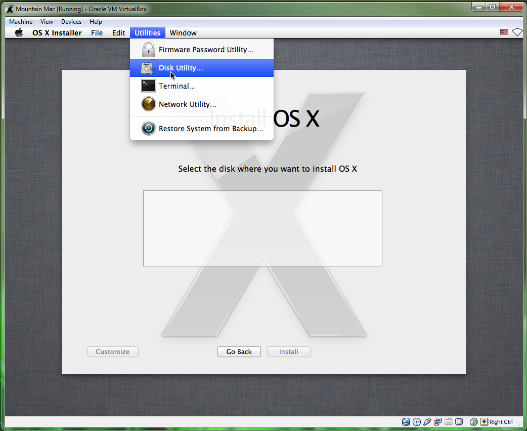 Mac OSX can only be installed on a completely clean disk, so you need to use Disk Utility to wipe your Virtualbox hard disk. Click on the Virtualbox hard disk in Disk Utility and erase it. Don’t worry, there’s nothing important on it.