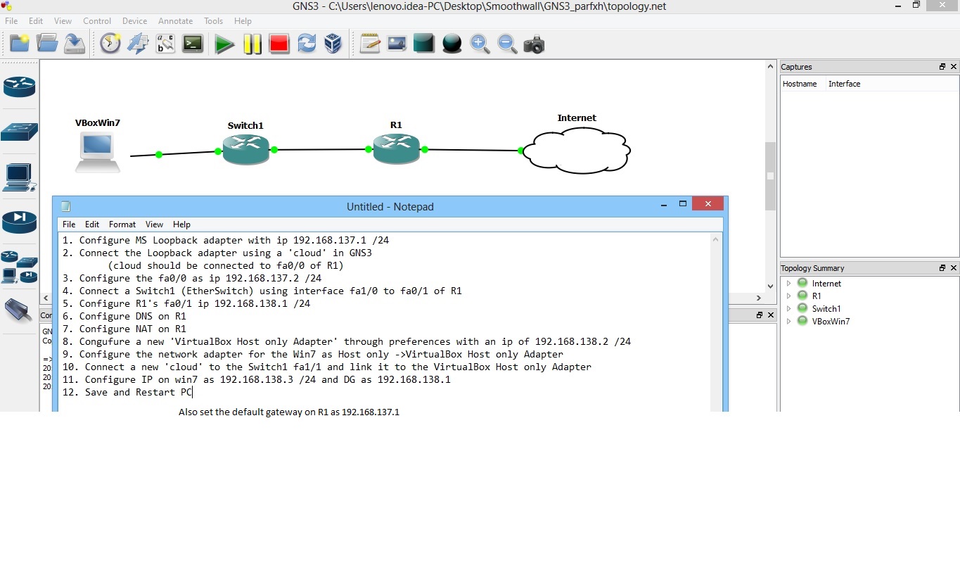 For Windows users, click on the box directly beneath Generic Ethernet NIO, and choose the network adapter you wish to use. For Linux users, click on the drop-down box to choose your network adapter (either your real adapter or a loopback adapter). Click the Add button and OK. You will need to configure the IP settings for your computer’s adapter, and then use theAdd a link toolbar button to create your connection.